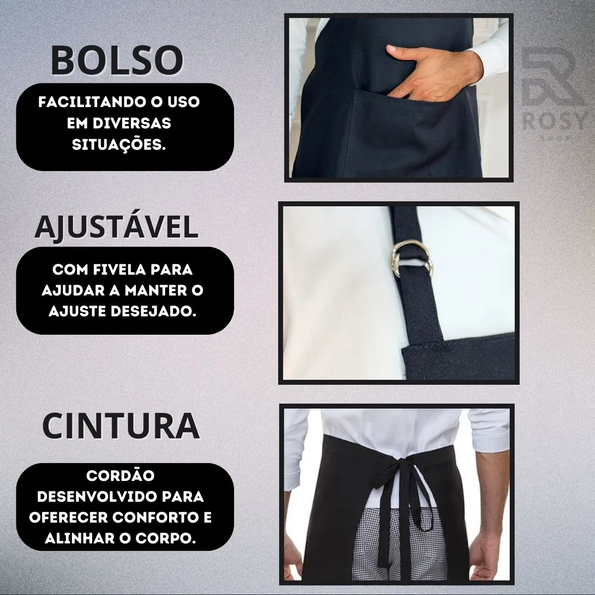 Seu design funcional conta com um bolso frontal espaçoso para guardar utensílios, pedidos ou pequenos acessórios de cozinha, além de alça com fivela ajustável, garantindo conforto e ajuste ideal para diferentes tipos de corpo.