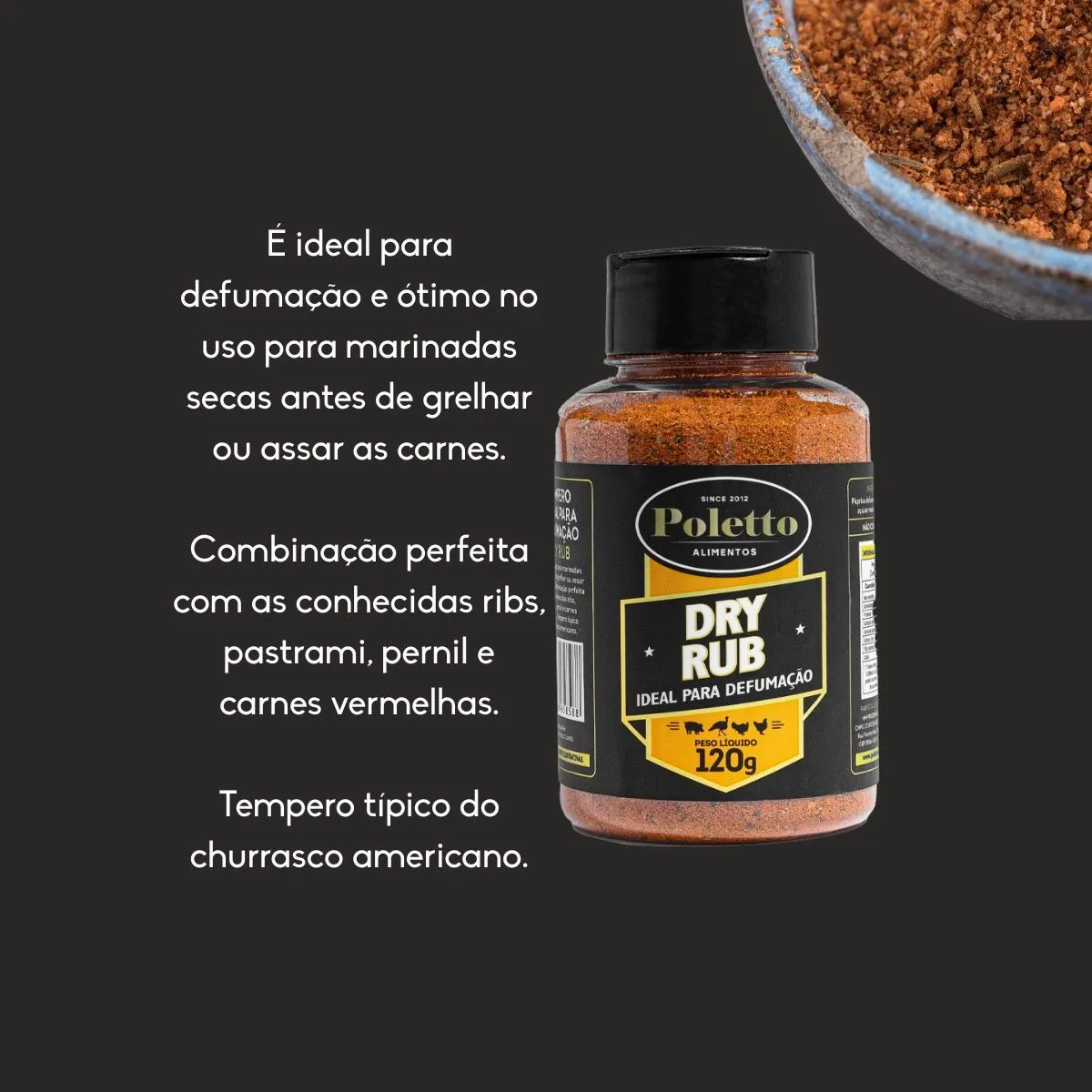 - Dry Rub (120g): Ideal para defumação e marinadas secas. Combina perfeitamente com ribs, pastrami, pernil e carnes vermelhas.