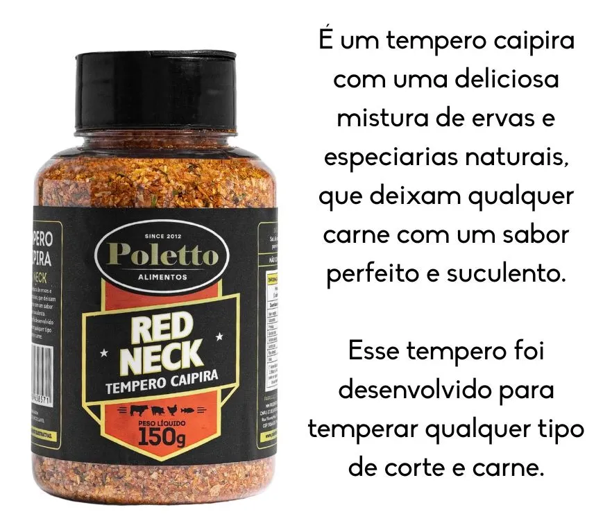 - Red Neck (150g): Tempero caipira com sabor marcante e equilibrado, excelente para qualquer tipo de carne.