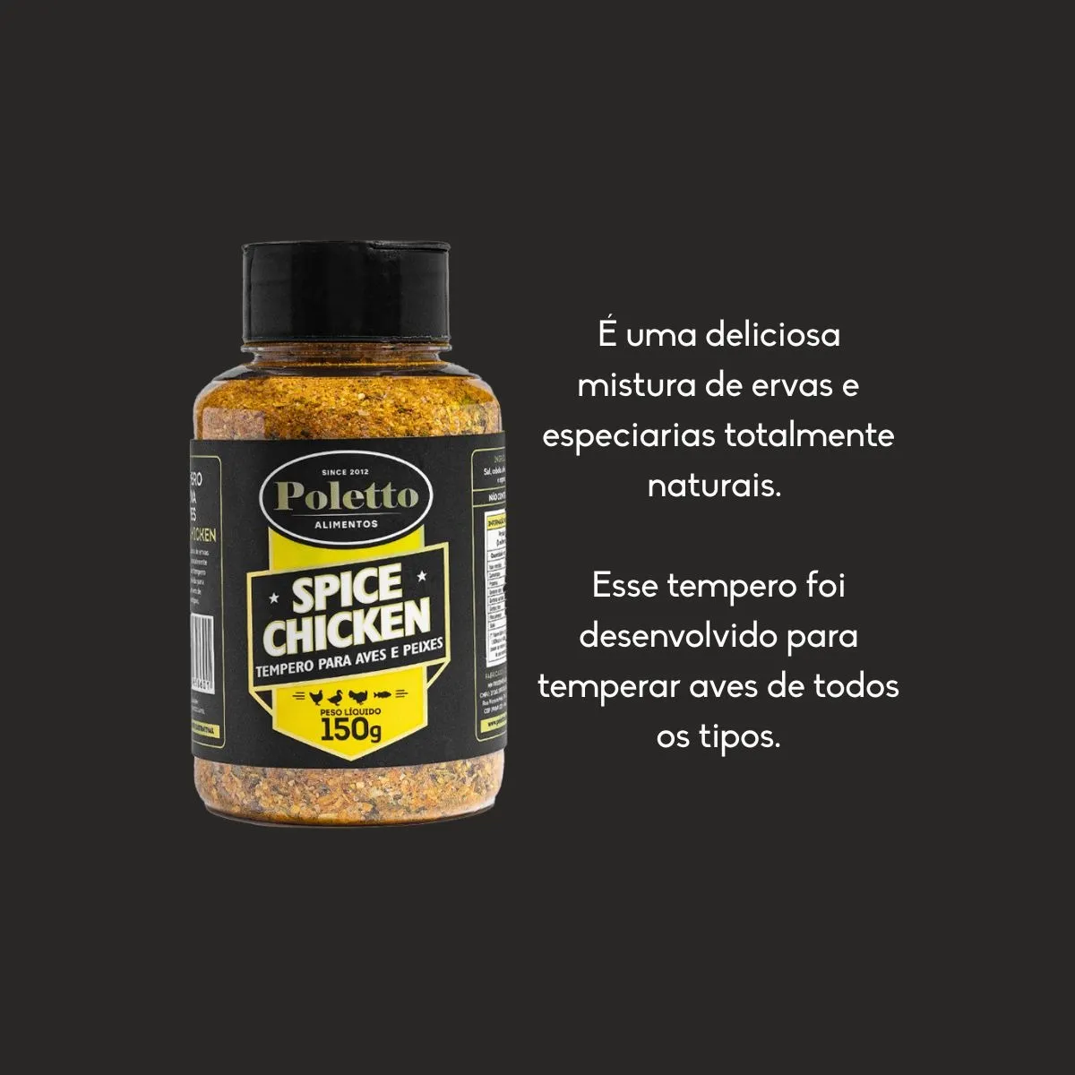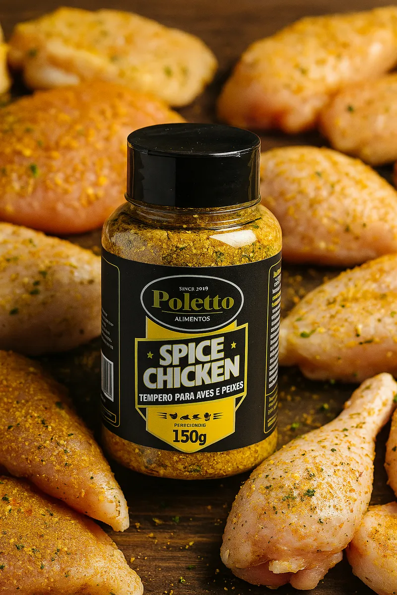 Ingredientes: Sal, cebola, alho, coloral e especiarias. - Spice Chicken (150g): Perfeito para aves e peixes, realçando o sabor natural com leve toque de açafrão.